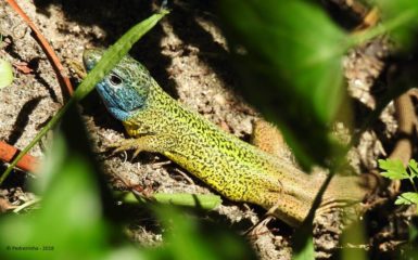 Lagarto-de-água (Lacerta schreiberi) – macho. Local: Margem direita do Rio Vez, ecovia, Guilhadeses. Data: 15-05-2018. Foto: Bernardete Amorim.